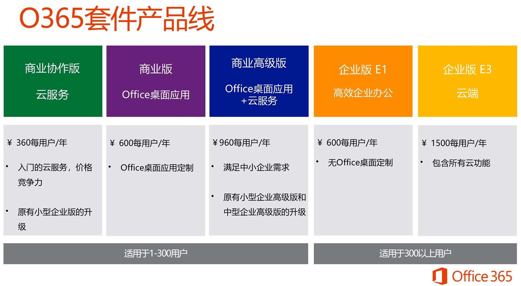 Office 365 将 Office 桌面端应用的优势结合企业级邮件处理、文件分享、即时消息和可视网络会议(Exchange Online,SharePoint Online 和 Skype for Business)的需求融为一体,满足不同类型企业的办公需求。
